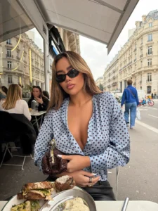 E veshur me një bluzë elegante me pika dhe me një çantë të veçantë, Festa thur ndjeshmëri dhe stil në çdo detaj. Ngjyra e syzeve të saj të diellit harmonizohet më së miri me ambientin parisien, duke krijuar një tablo të përsosur për një drekë nën qiellin e hapur.
